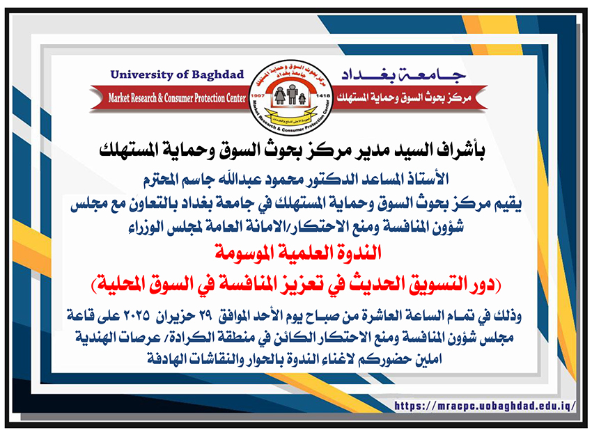 سيقيم مركز بحوث السوق وحماية المستهلك في جامعة بغداد بالتعاون مع مجلس شؤون المنافسة ومنع الاحتكار / الامانة العامة لمجلس الوزراء الندوة العلمية الموسومة (دور التسويق الحديث في تعزيز المنافسة في السوق المحلية) وذلك في تمـام الساعة العاشرة من صبـاح يوم الأحد الموافق 29 حزيران 2025 على قاعة مجلس شؤون المنافسة ومنع الاحتكار الكائن في منطقة الكرادة / عرصات الهندية