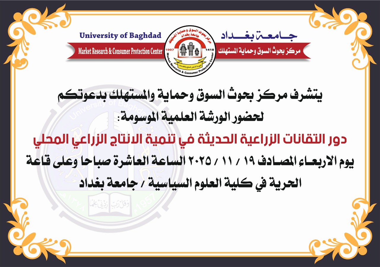 سيقيم مركز بحوث السوق وحماية المستهلك الورشة العلمية الموسومة : (دور التقانات الزراعية الحديثة في تنمية الانتاج الزراعي المحلي) بالتعاون مع وزارة الزراعة، وذلك يوم الاربعاء الموافق 19/11/2025 في قاعة الحرية / كلية العلوم السياسية – جامعة بغداد.