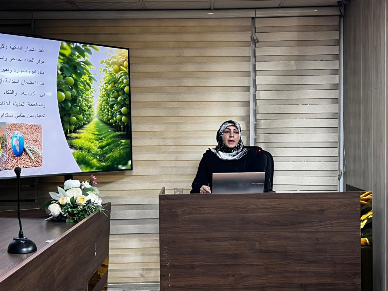 ثم محاضرة بعنوان (دور التقنيات الحديثة في تعزيز انتاجية اشجار الفاكهة و تحقيق الامن الغذائي) قدمت من قبل أ.م.د. شيماء محمد جبير التدريسية في كلية علوم الهندسة الزراعية/ قسم البستنة وهندسة الحدائق / جامعة بغداد.