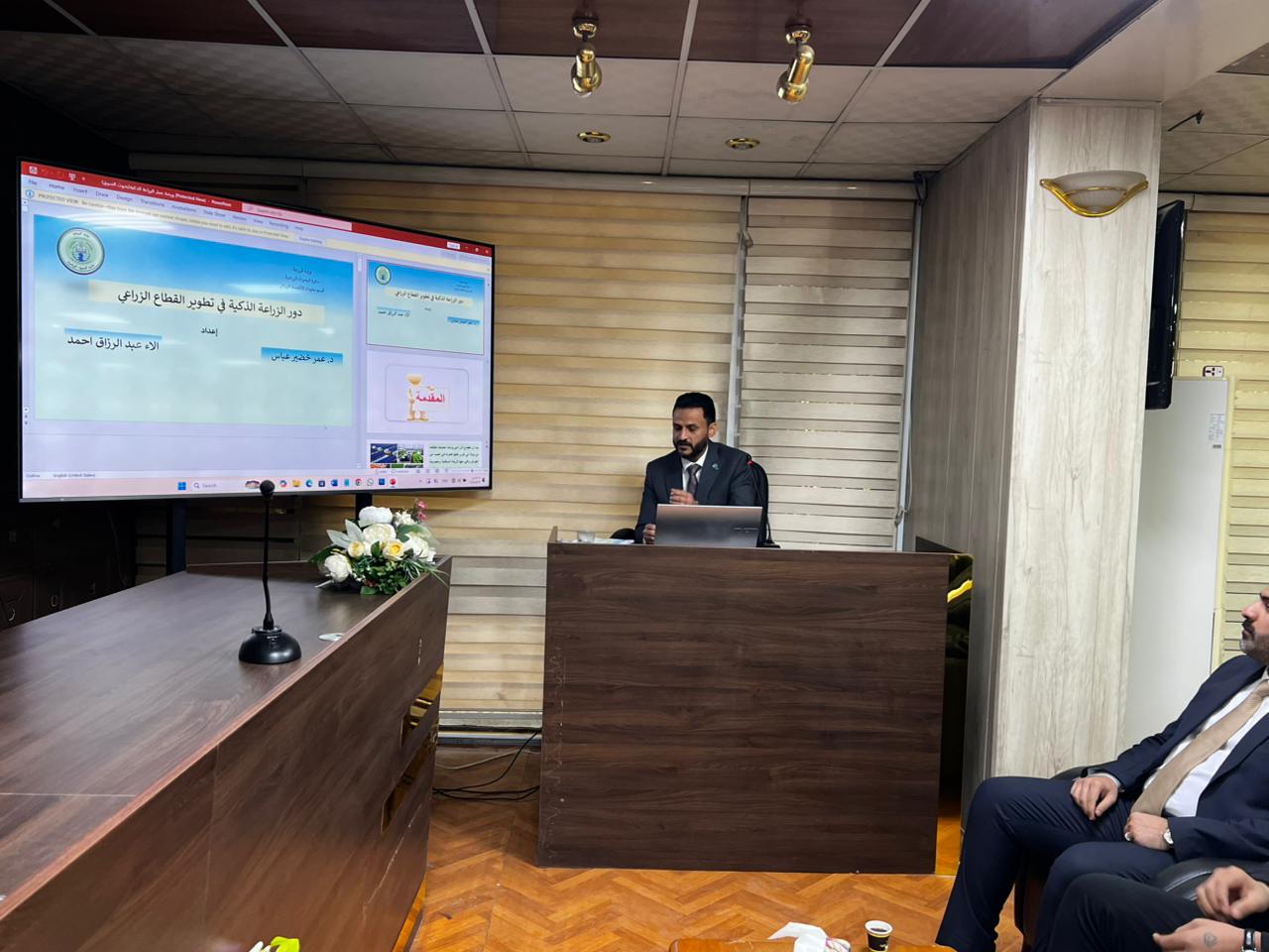 ليشارك بعدها الدكتور عمر خضير عباس و الست الاء عبد الرزاق احمد ممثلين عن وزارة الزراعة/ دائرة البحوث الزراعية/ قسم بحوث الاقتصاد الزراعي محاضرة بعنوان (دور الزراعة الذكية في تطوير القطاع الزراعي)